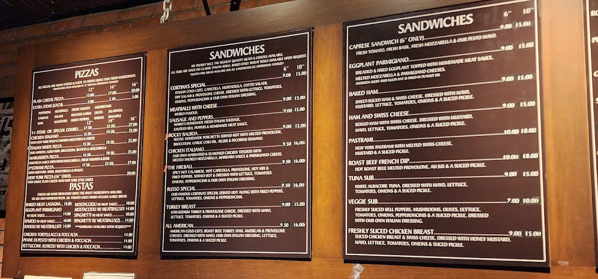 We love Cortinas, we have been to a handful of Italian places in Orange county and Cortinas is always at the top of the list when it comes to wanting a cooked Italian meal. Their pizza is fresh and delicious as well as all their great sandwiches and pasta dishes. We have yet to find something bad on the menu. Service is always friendly and professional, order is always right. Food comes out fast, hot and fresh. We love to hit up the market next door after our meal to grab all of our staple imported Italian goods to take home. Also, the baked goods are good, we grabbed fig cookies the last time, a Sicilian favorite, delicious! Their fresh Italian bread is great as well, highly recommended!